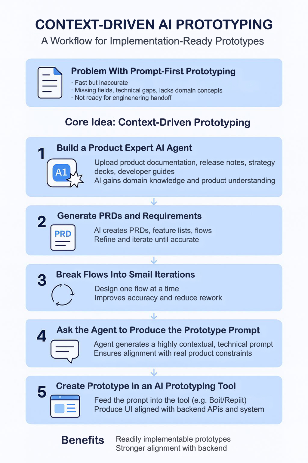 This realization pushed me to evolve my process into what I now call context‑driven prototyping—an approach focused on giving AI enough product context to generate prototypes that reflect real system behavior, data models, and product constraints.